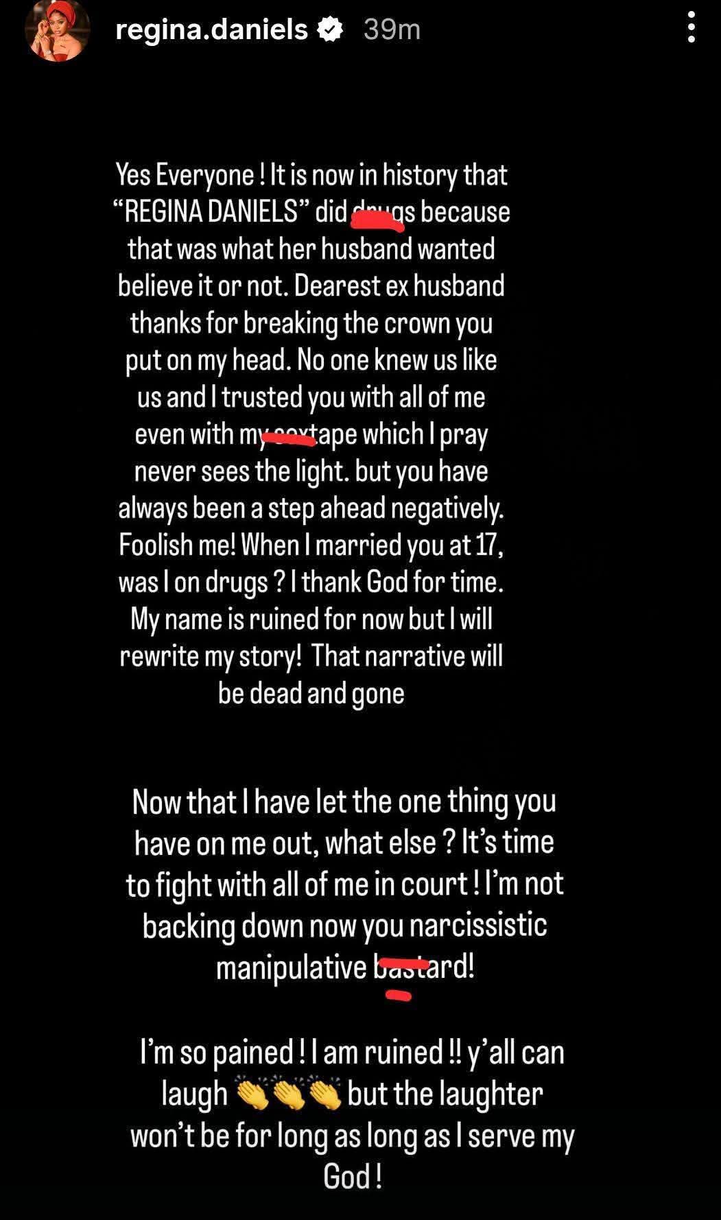 Nollywood actress Regina Daniels has escalated her public feud with billionaire politician and estranged husband, Senator Ned Nwoko, in a series of emotional Instagram Stories posted on Sunday. In the posts, the 24-year-old star admitted to past drug use but claimed it was encouraged by Nwoko, accused him of holding a private sex tape over her head, and vowed to fight him in court to “rewrite” her story.