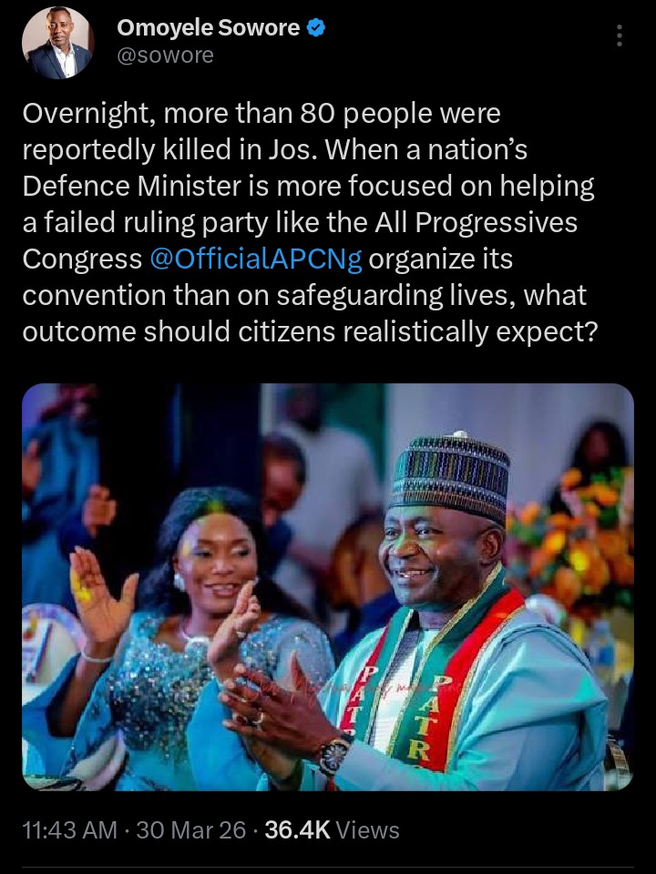 “Overnight, more than 80 people were reportedly killed in Jos. When a nation’s Defence Minister is more focused on helping a failed ruling party like the All Progressives Congress organise its convention than on safeguarding lives, what outcome should citizens realistically expect?” he wrote.
