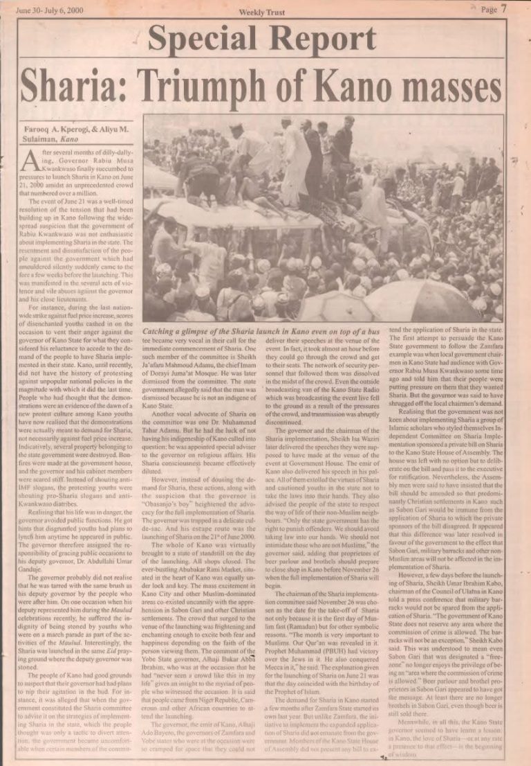 My June 30, 2000, Weekly Trust report, co-written with the paper’s then Kano correspondent Sulaiman Aliyu and titled “Sharia: Triumph of Kano Masses,” showed that Kwankwaso resisted declaring Sharia for months and was at odds with both everyday people and the Muslim clerical establishment over the matter.